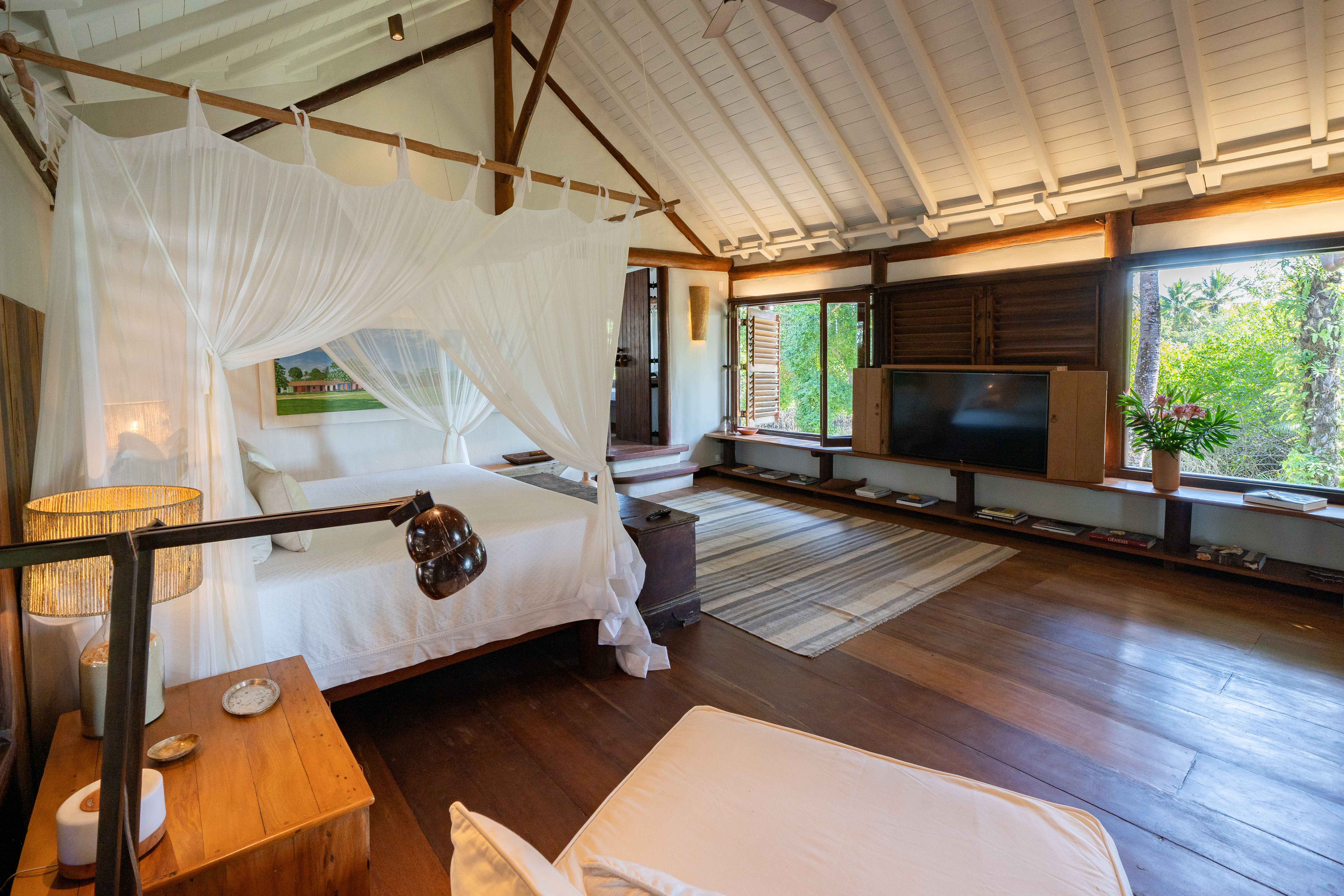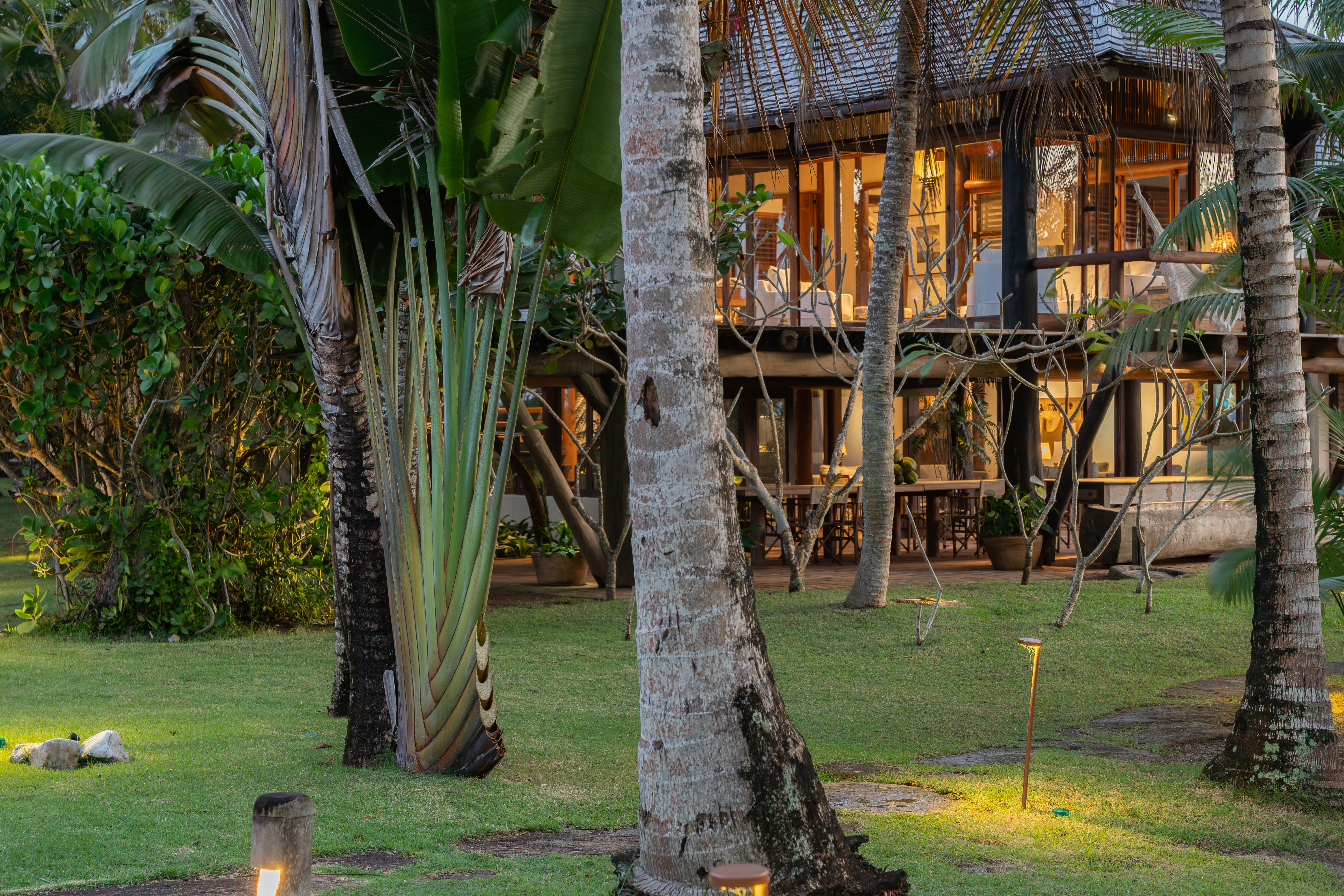 O extenso jardim é um capítulo à parte. Cada canto foi plantado com propósito, pensado para formar um lar. Por aqui, a natureza é protagonista: caranguejos que às vezes se aventuram fora de suas tocas, patos selvagens que se aquecem ao sol da manhã, galinhas passeando livremente, pássaros diversos que preenchem o ar com cantos e até macaquinhos curiosos (ah, e um lembrete: evite alimentá-los).