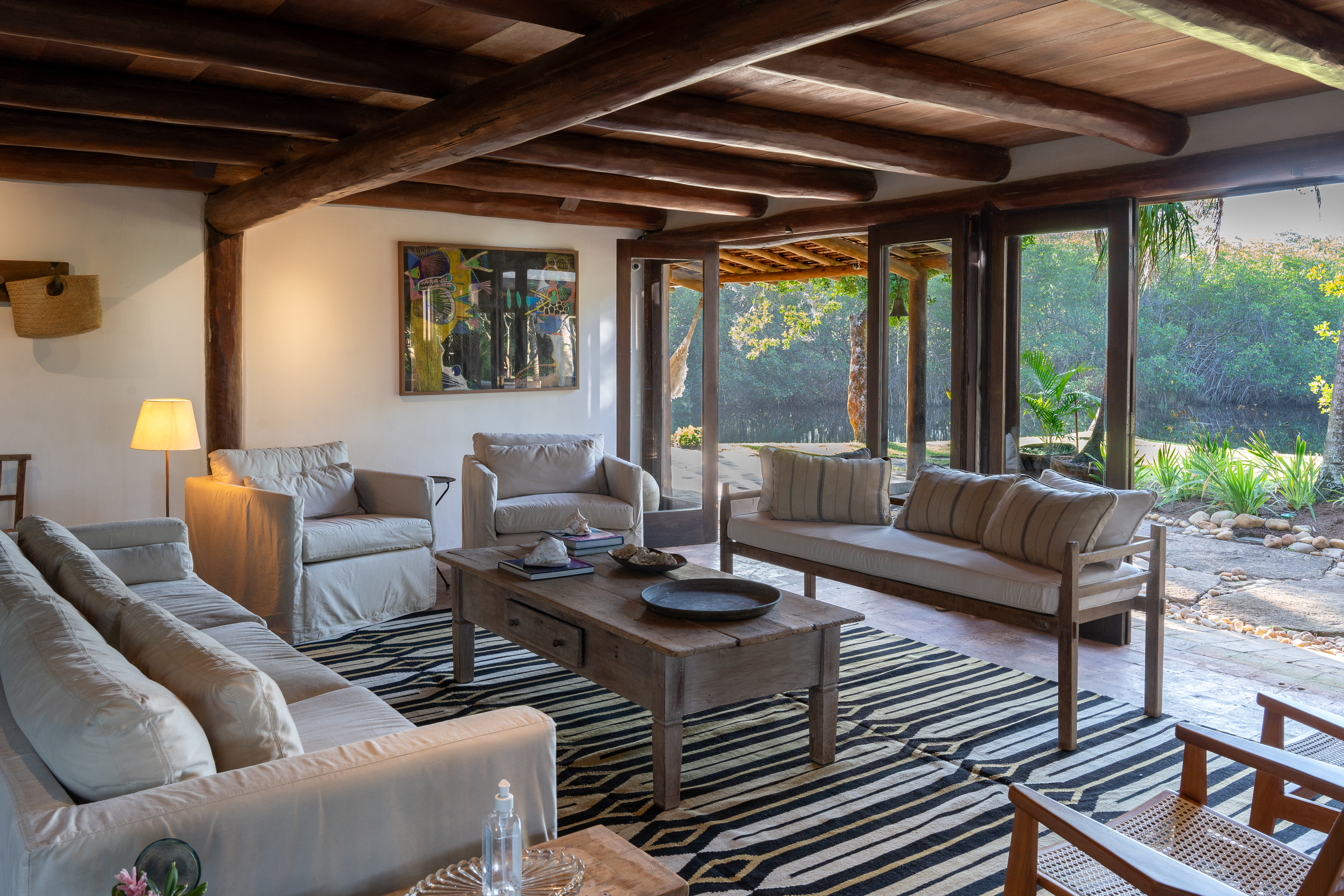 Localizada na Praia do Rio da Barra, uma das melhores de Trancoso, a casa está há 10 minutos do Quadrado, em um condomínio com segurança 24 horas e os vizinhos são afastados. Em síntese, privacidade é um adjetivo da casa.